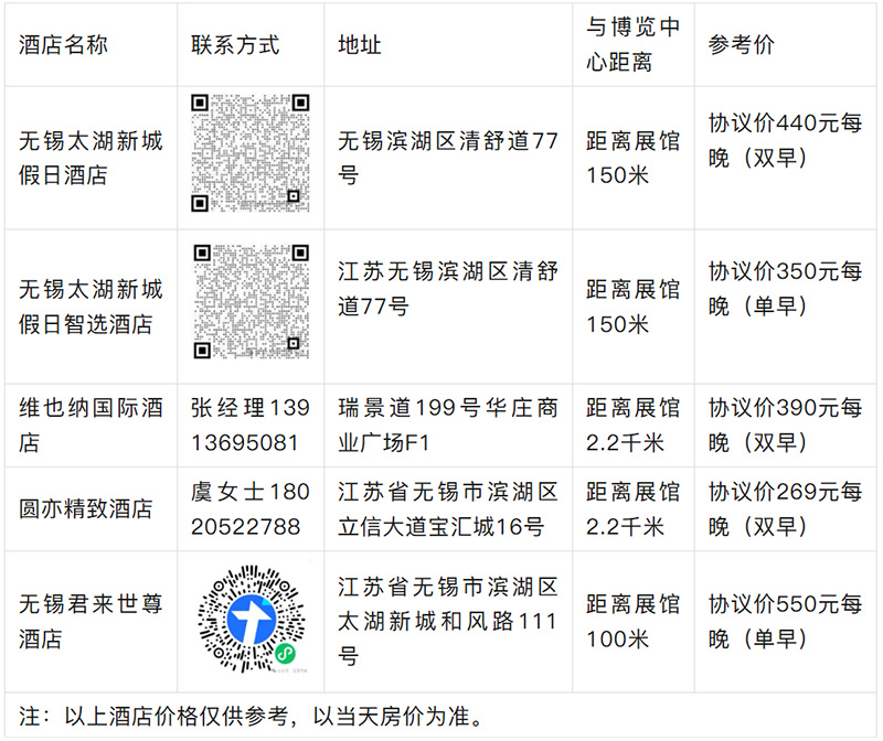 本次会议不集中安排住宿,各位参会人员可以与下列酒店联系,春季房源紧张,需提前预订。报江苏省气体工业协会和2024中国国际气体工业博览会参会代表可享受协议价。